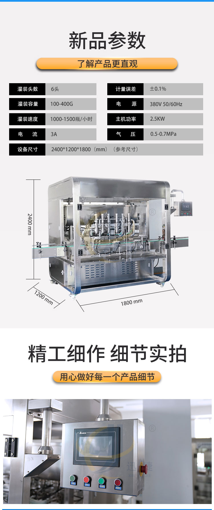 辣椒醬灌裝機采用活塞式灌裝原理,適用于調(diào)味品中帶顆粒并且濃度較大的辣椒醬、豆瓣醬、花生醬、香菇醬、果醬、牛油火鍋底料、紅油火鍋底料、蝦醬等較為粘稠醬類的灌裝。