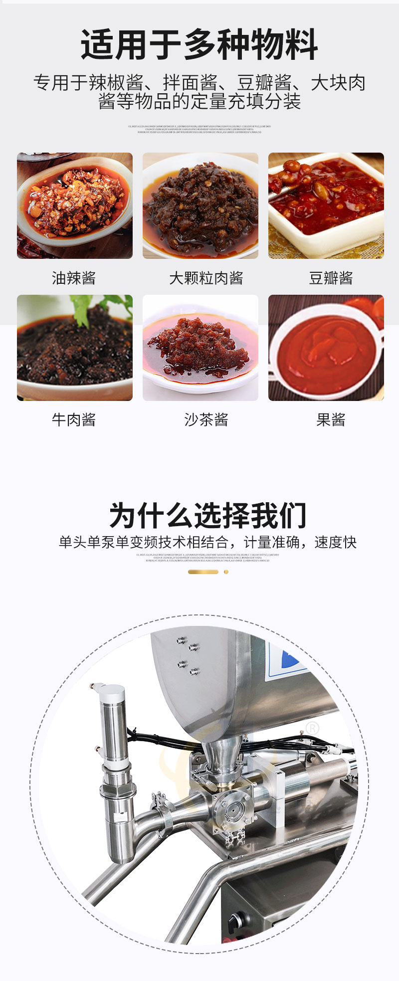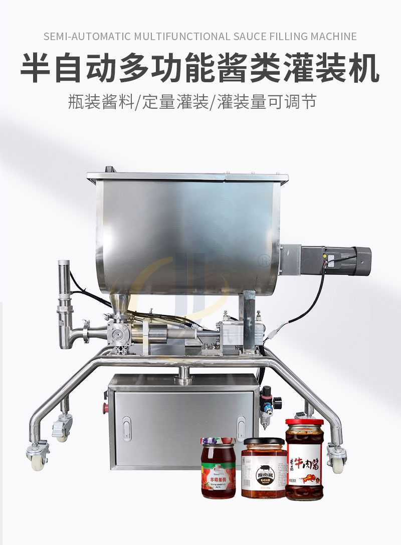 半自動(dòng)醬類灌裝機(jī)適合于將各類粘稠體及含有各種固體物質(zhì)如辣椒、花生、肉塊、佐料等物體的醬類和油、料分離的火鍋底料等灌裝于各種容器中