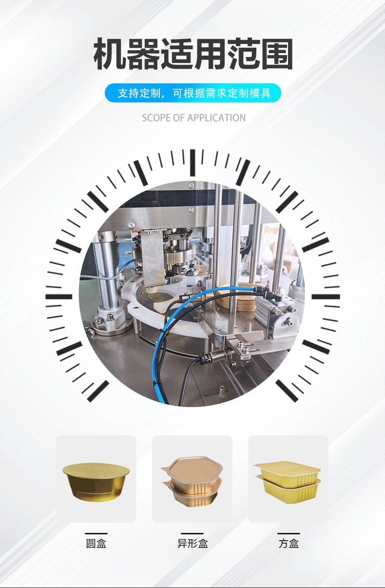 全自動鋁箔盒封口機用途:用于咖喱醬、調(diào)料品、火鍋料、果醬、辣椒醬、醬油醋、番茄醬等杯盒的自動灌裝與封口。