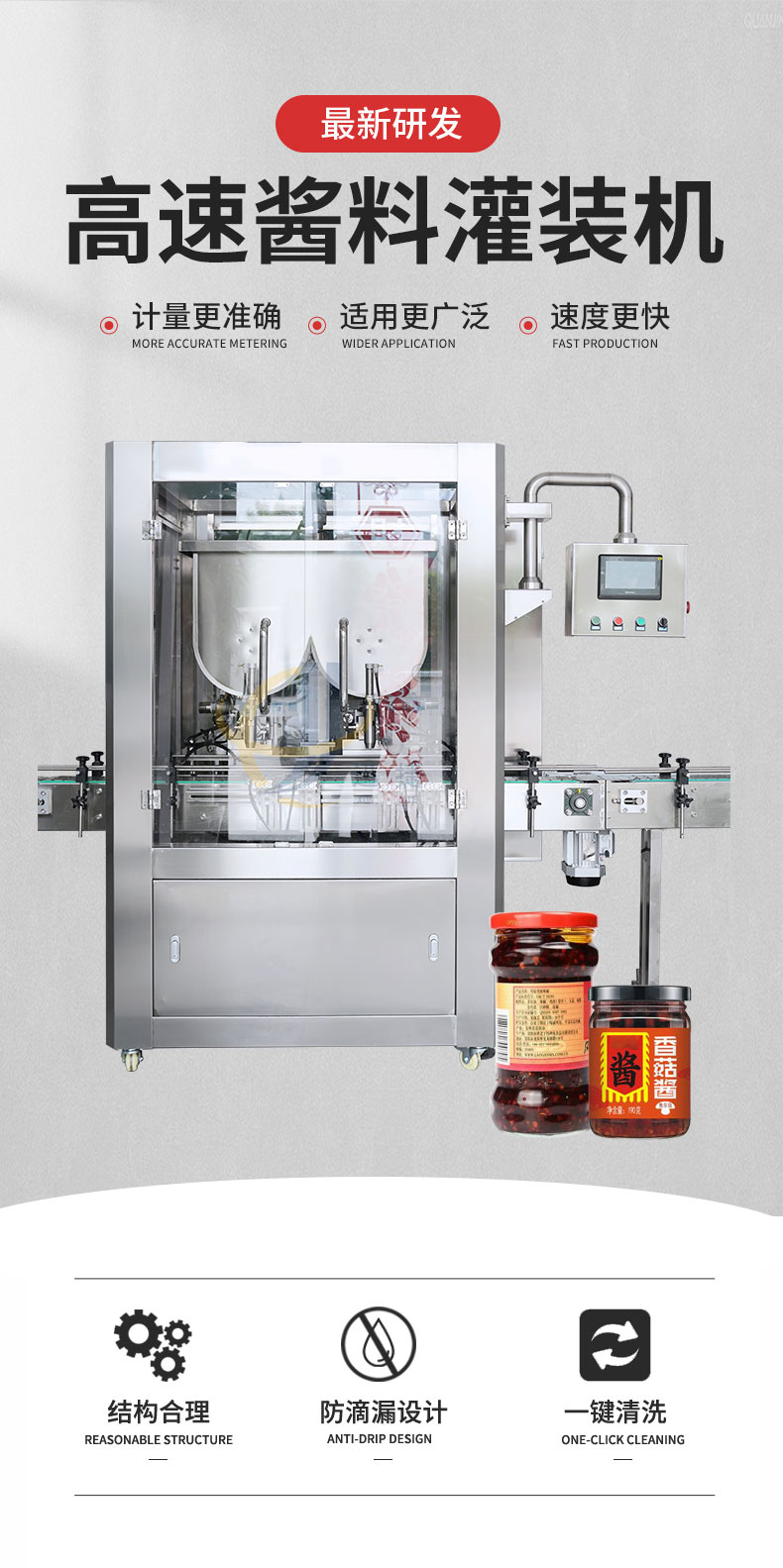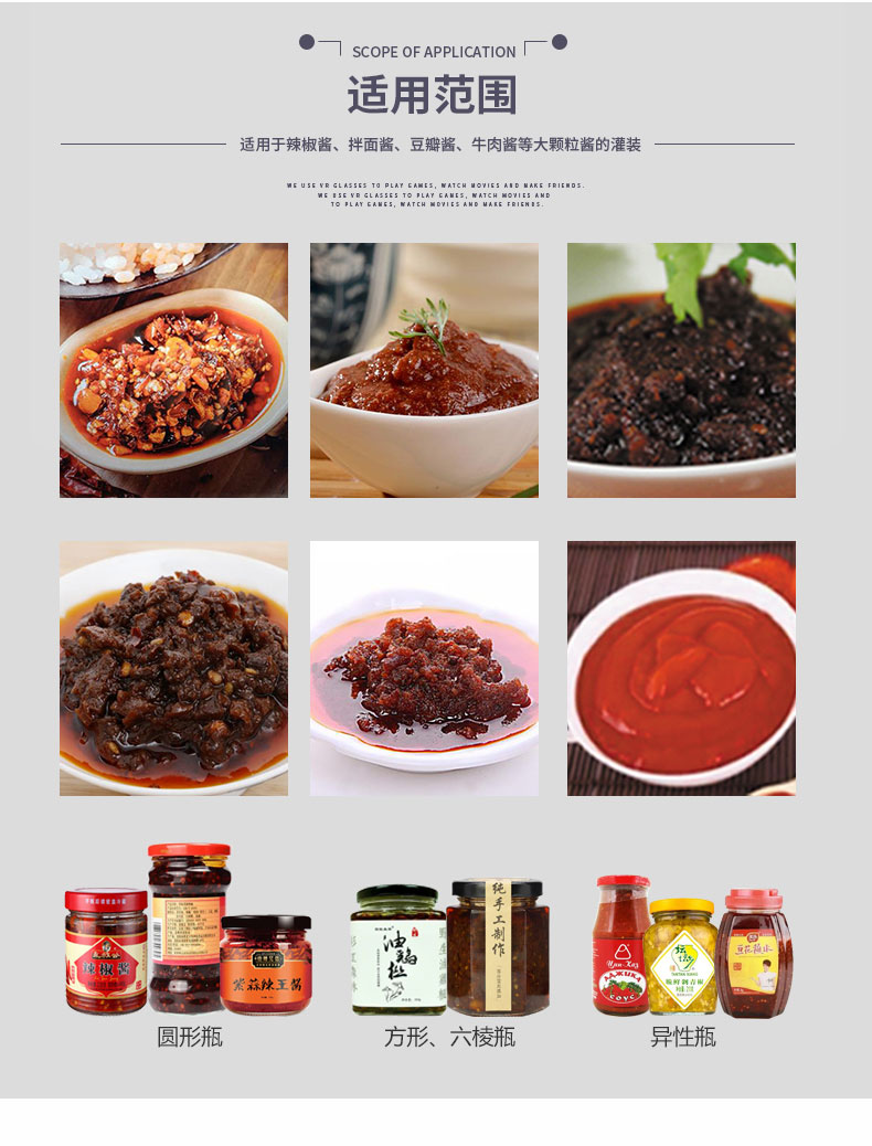 雙頭高速醬料灌裝機(jī)適用于調(diào)味品中帶顆粒并且濃度較大的辣椒醬、豆瓣醬、花生醬、香菇醬、果醬、牛油火鍋底料。