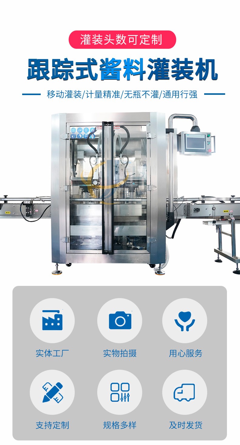 跟蹤式調(diào)味醬灌裝機(jī)設(shè)備配置定量灌裝、定液位灌裝兩種方式,計(jì)量誤差2克。定量灌裝保證每一瓶的灌裝質(zhì)量。