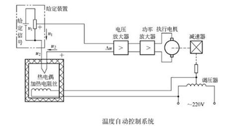 如果將控溫過程中的人工操作 (檢測和調(diào)節(jié)) 換由自動控制裝置完成,則成為包裝機自動控溫系統(tǒng)。如下圖所示,檢測元件熱電偶檢測恒溫箱內(nèi)的溫度,并將溫度轉(zhuǎn)換為對應(yīng)的電壓信號2 ,同時反饋給比較器。比較器比較表示給定溫度的給定電壓信號1與檢測電壓信號2的大小,得到溫差信號,其大小和正負代表溫差的大小和方向。溫差信號△經(jīng)電壓放大和功率放大后,控制執(zhí)行電機的轉(zhuǎn)速和方向,執(zhí)行電機通過傳動裝置拖動調(diào)壓器觸頭調(diào)節(jié)供熱電壓。當(dāng)溫度偏高時,動觸頭向著減小電壓( 電流)方向轉(zhuǎn)動; 反之,當(dāng)溫度偏低時,動觸頭則向著增大電壓( 電流)方向運動,直至恒溫箱內(nèi)溫度達到給定溫度,溫差信號△=0 時觸頭停止運動。