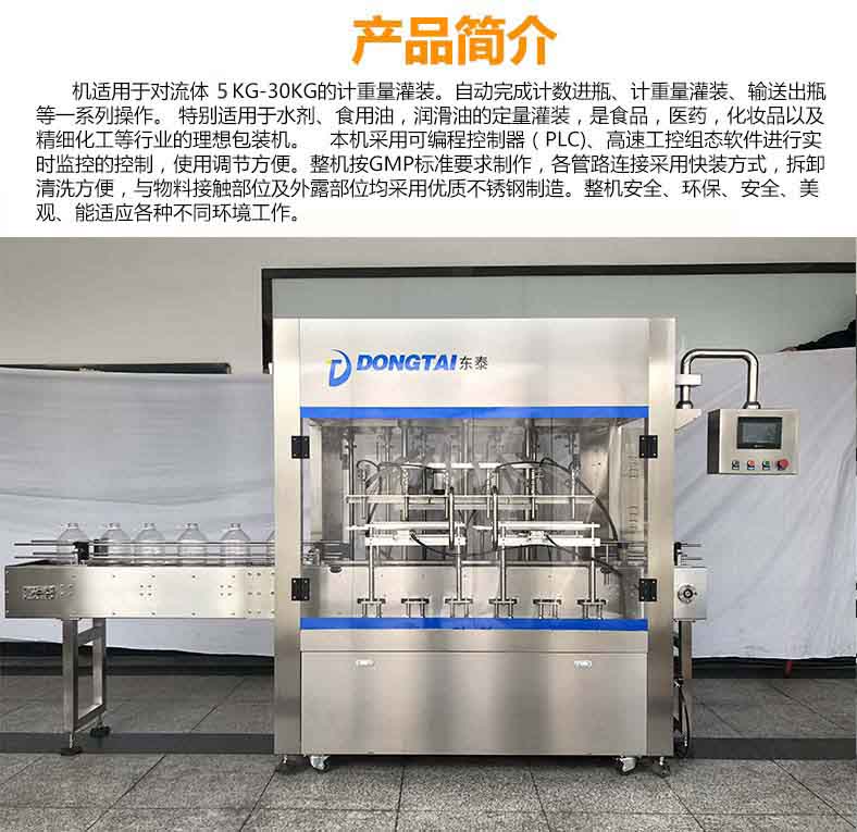 本機(jī)適用于對(duì)流體5kg-30kg的計(jì)重量灌裝。自動(dòng)完成計(jì)數(shù)進(jìn)瓶、計(jì)重量灌裝、輸送出瓶等一系列操作。 特別適用于水劑、食用油,潤(rùn)滑油的定量灌裝,是食品,醫(yī)藥,化妝品以及精細(xì)化工等行業(yè)的包裝機(jī)。本機(jī)采用可編程控制器(PLC)、高速工控組態(tài)軟件進(jìn)行實(shí)時(shí)監(jiān)控的控制,使用調(diào)節(jié)方便。整機(jī)按GMP標(biāo)準(zhǔn)要求制作,各管路連接采用快裝方式,拆卸清洗方便,與物料接觸部位及外露部位均采用優(yōu)質(zhì)不銹鋼制造。整機(jī)安全、環(huán)保、安全、美觀、能適應(yīng)各種不同環(huán)境工作。