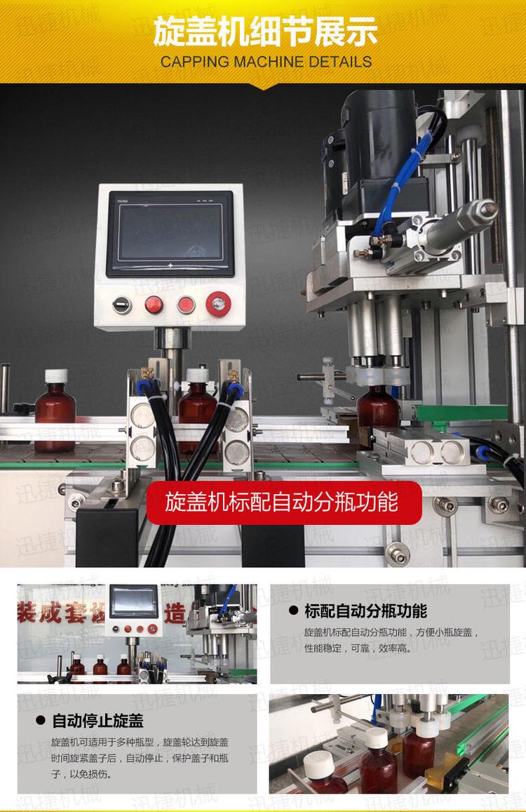 旋蓋優(yōu)勢有:旋蓋機(jī)擁有做到自動分瓶功能,當(dāng)瓶蓋旋緊時可自動停止旋蓋,保護(hù)了蓋子和瓶子免受損傷。塑料瓶消毒水灌裝機(jī)(小玻璃瓶溶液灌裝機(jī))整機(jī)由304不銹鋼材質(zhì)組成,灌裝效率和精度高,雙重保證您的物料的包裝效果。