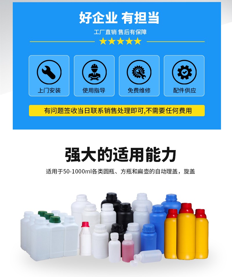 1、通用性強(qiáng):適用于50-1000ml各類圓瓶、方瓶和扁壺的自動(dòng)理蓋,旋蓋;