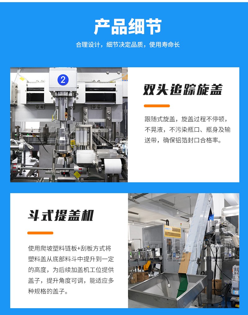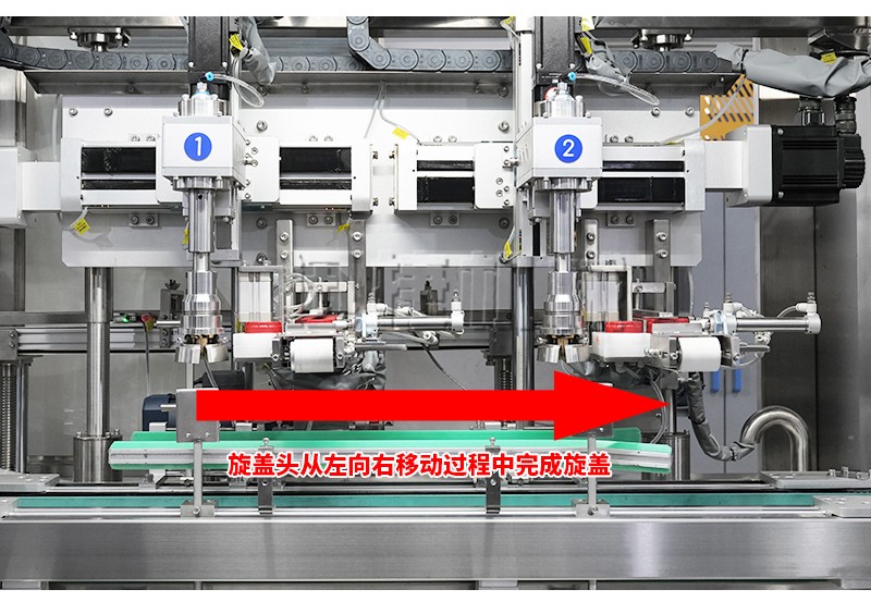 2、品質(zhì)高:跟隨式旋蓋,旋蓋過程不停頓,不晃液,不污染瓶口、瓶身及輸送帶,確