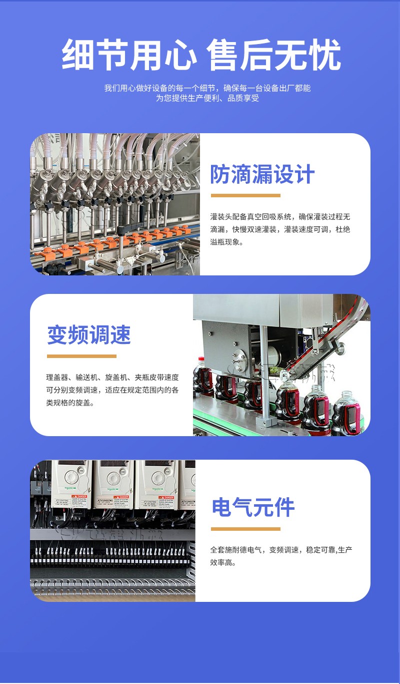 4、定量灌裝,一鍵調(diào)節(jié)。快速接口易拆易洗,無滴漏下潛灌裝。