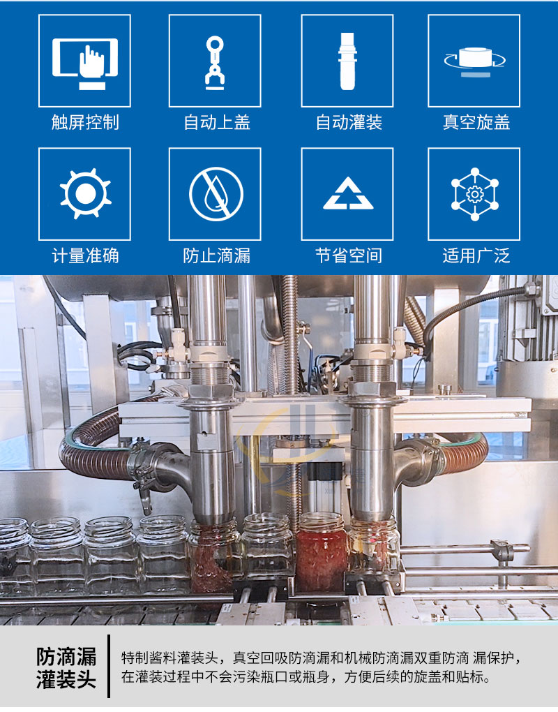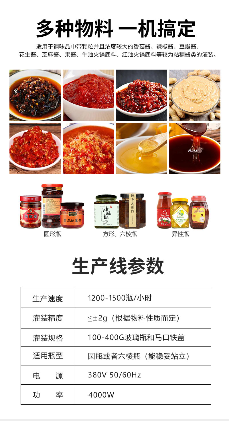 小型醬料灌裝生產(chǎn)線適用于調(diào)味品中帶顆粒并且濃度較大的香菇醬、辣椒醬、豆瓣醬、花生醬、芝麻醬、果醬、牛油火鍋底料