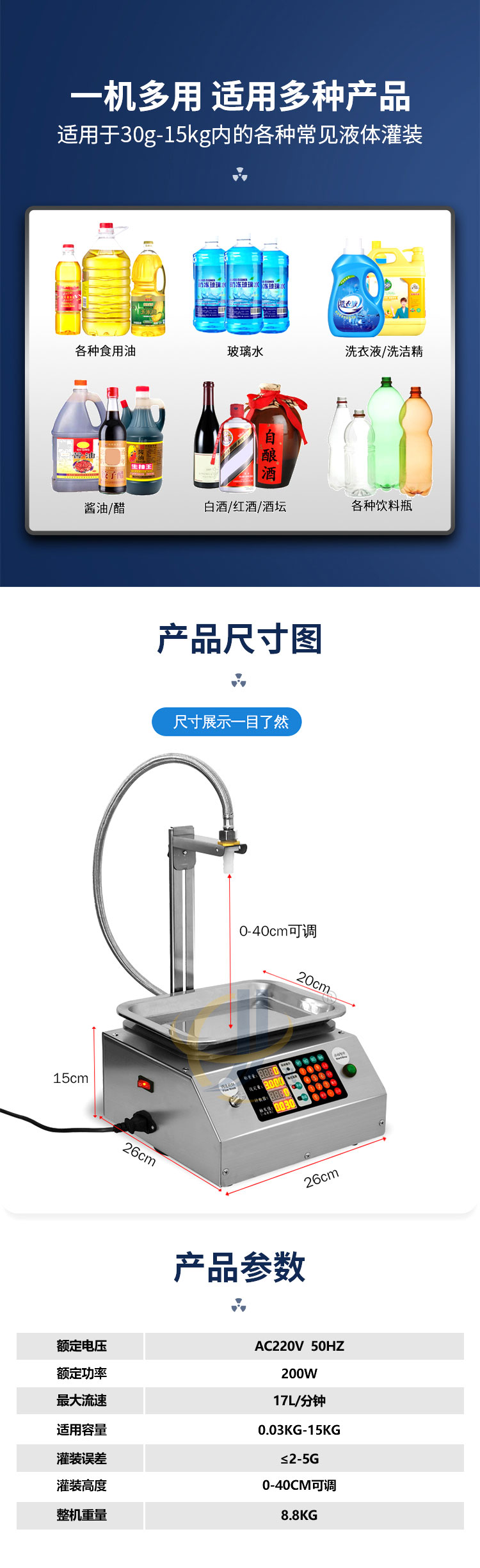 稱重式液體灌裝機(jī)適用于30g-15kg內(nèi)的各種常見液體灌裝。采用精度高,反應(yīng)靈敏的電子秤作為計(jì)量標(biāo)準(zhǔn)。其性能可以超越所有時(shí)間定量的方式。