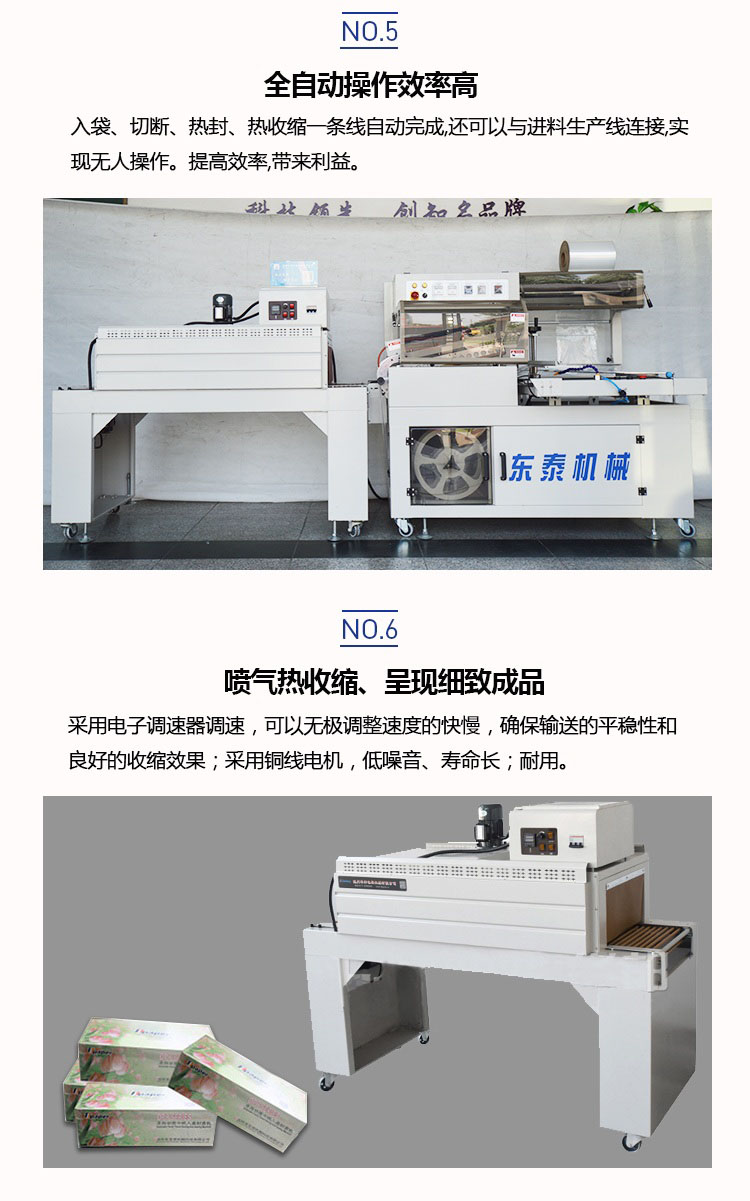自動塑料膜熱收縮包裝機結構緊湊占地面積小,非常適合配套自動包裝流水線完成產(chǎn)品的自動無人化包裝,適合于單個物品包裝或有底托物品包裝。自動送膜打孔裝置和手動調(diào)節(jié)的導膜系統(tǒng)以及手動調(diào)節(jié)的進料輸送平臺,可適于不同寬度和高度的產(chǎn)品,實現(xiàn)一臺機器滿足各種尺寸的包裝物品。